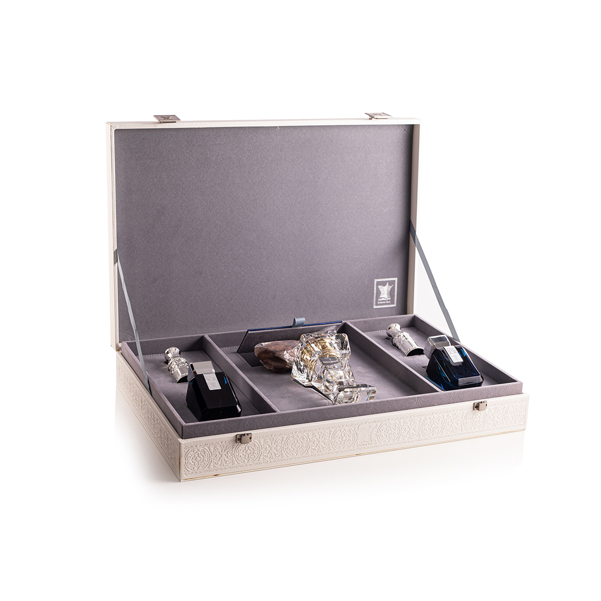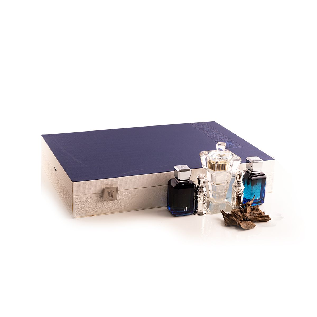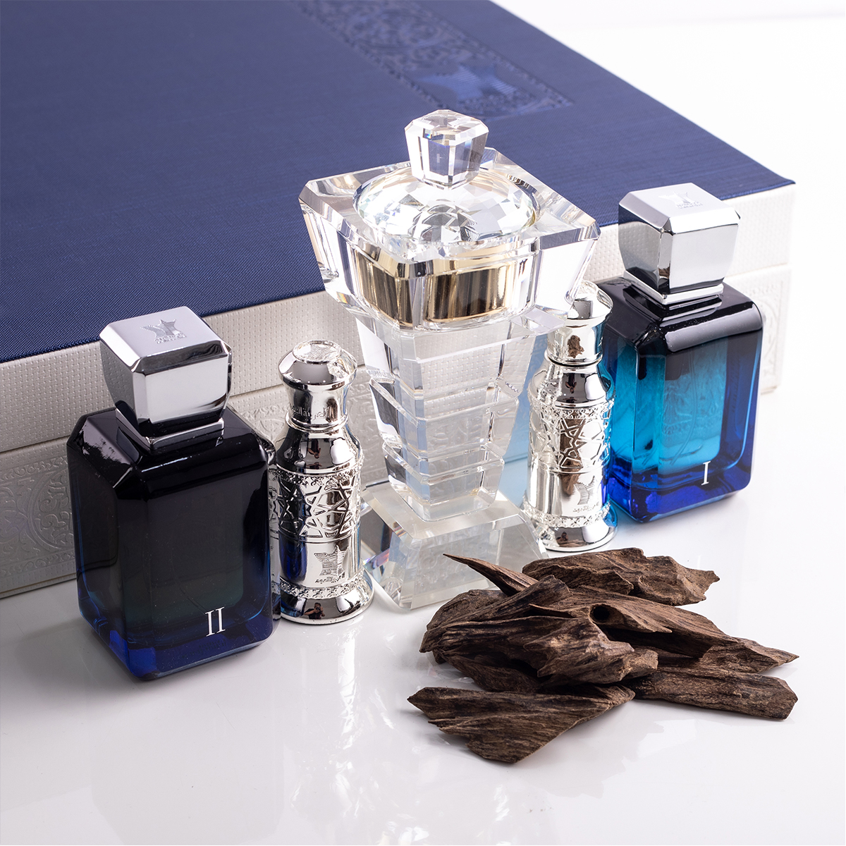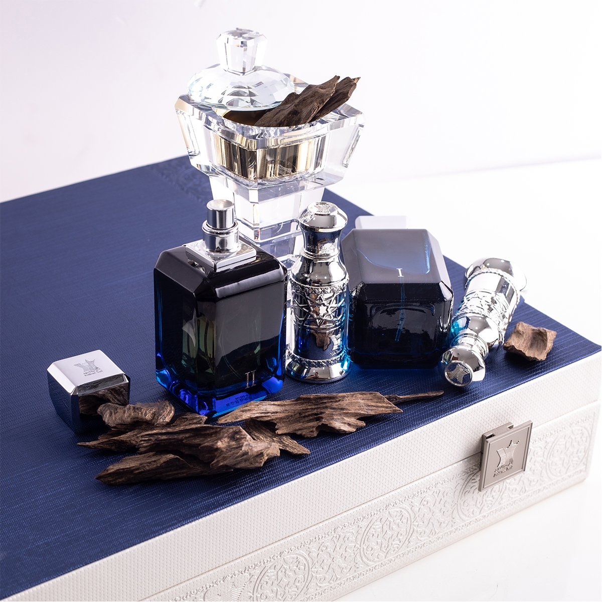 Deze prachtige kist heeft Cambodjaanse oud, houtolie, twee parfumflesjes en een moderne kristallen brander.