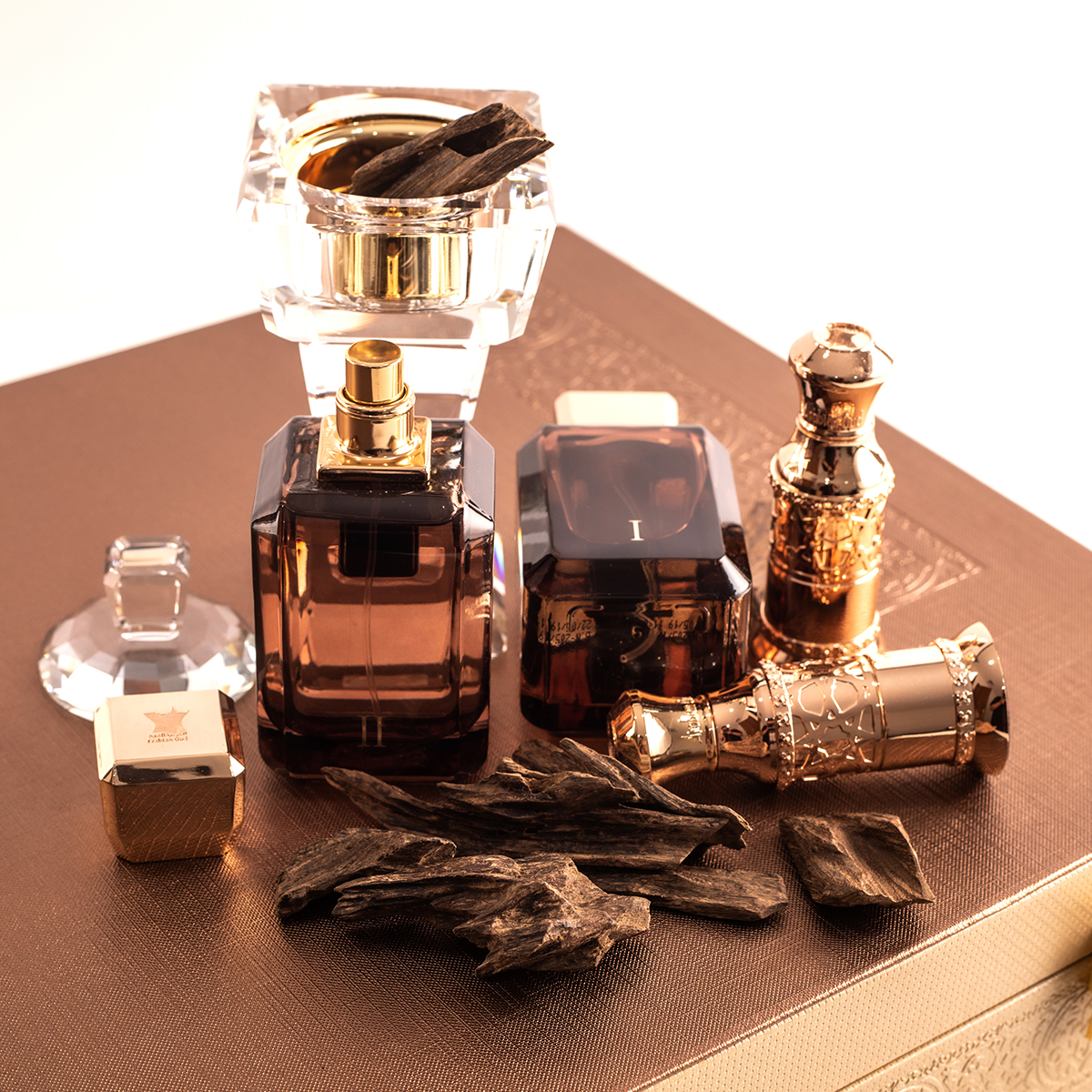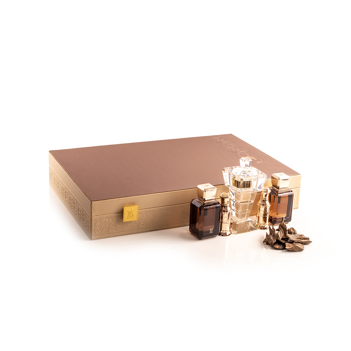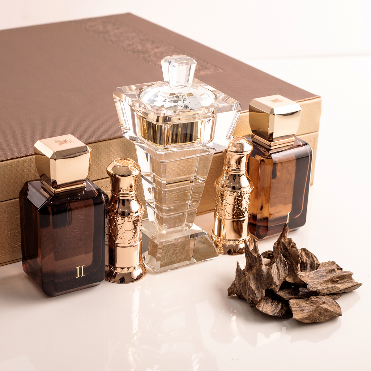 Deze prachtige kist heeft Cambodjaanse oud, houtolie, twee parfumflesjes en een moderne kristallen brander.